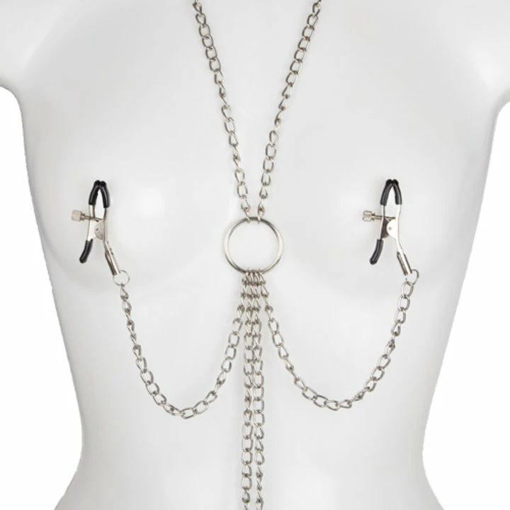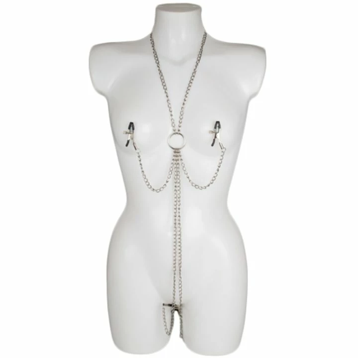 β’Β Β Nipple and labia clamps with a chain harnessΒ
