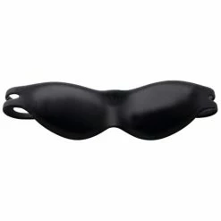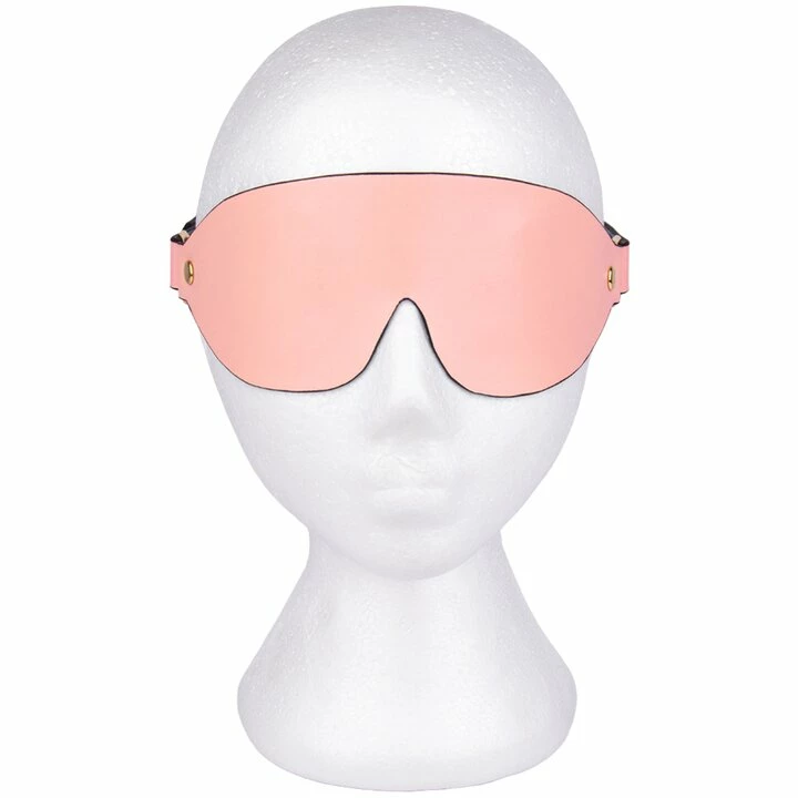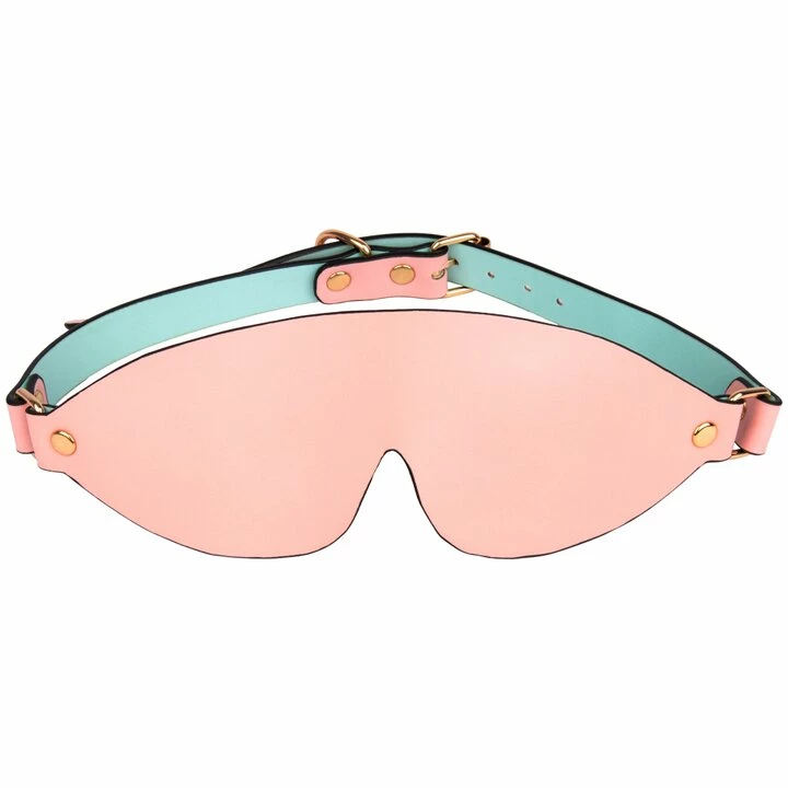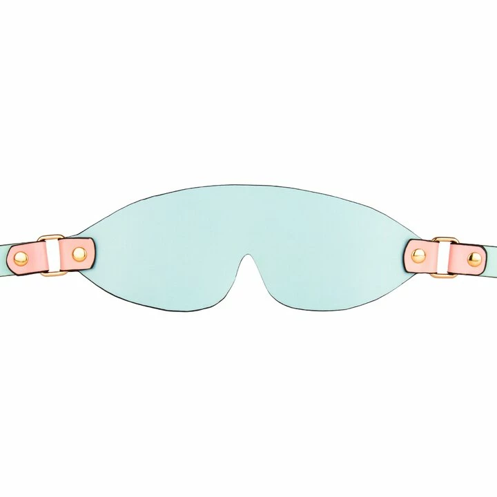 This luxury eye mask is expertly crafted from double-sided faux leather with a chic baby blue reverse and graphic black trim to beautify your bondage aesthetic.