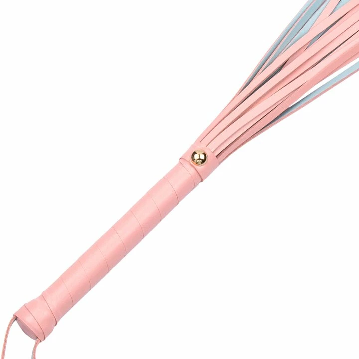 This elegant faux leather flogger features a stylish baby blue reverse and luxe gold stud details to give your bondage aesthetic a fashionable flair. Switch between stroking and stinging sensations as you sensually trail twenty tails across the skin, then flick the flogger to inflict a sharp, scattered blow.