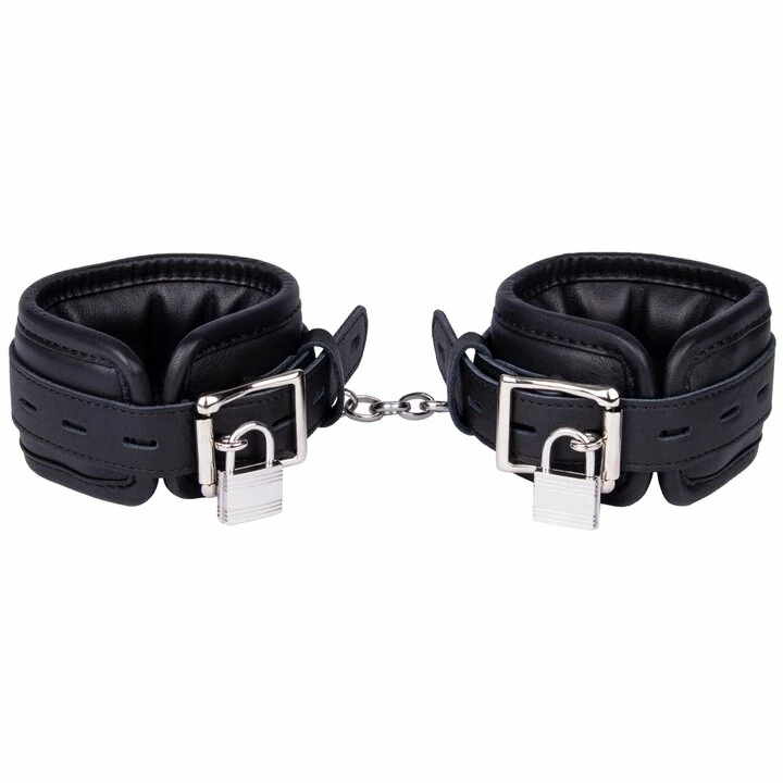 If you command the utmost confidence in your bondage gear, lock down your lover in the premium Erotica Black Leather Lockable Ankle Cuffs from Bondara Luxe. These classy cuffs are both buckle-fastened and individually lockable via two included padlocks for infallible restraint.