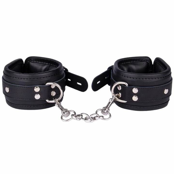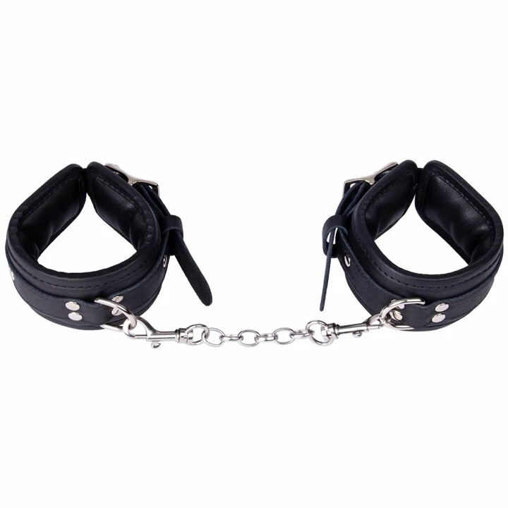 Each soft padded strap is adjustable for a satisfyingly snug fit up to a 15.5-inch circumference. Quality stitching and silver-tone hardware deliver superior build quality in real black leather, while the D-rings and detachable 6.5-inch chain allow creative, versatile bondage.ย
