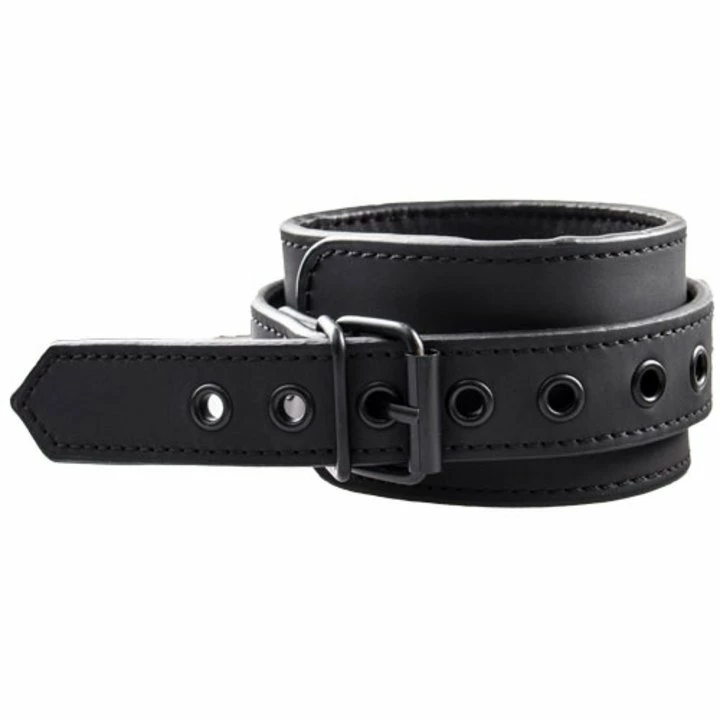 β’ Matte black, PU leather cuffs are adjustable and secured by a buckle