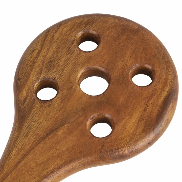This wicked piece of woodwork features a 5.5-inch wide head with five air-holes for a streamlined swing. Smoothly finished in natural grain Neem wood, this classic paddle is gratifying to grip, including a leather loophole to wrap around your wrist.