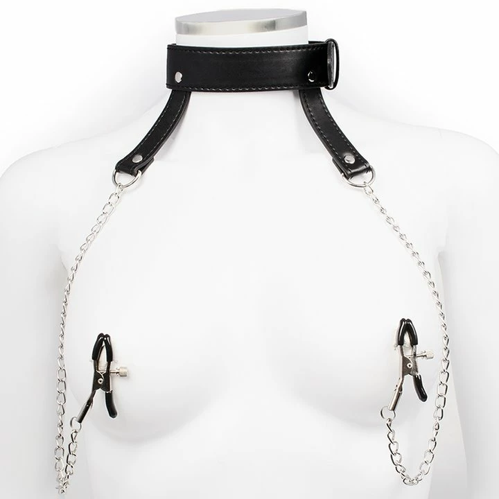 Merge two kinky fetishes together as you boost your bondage sessions with this Bondara Pinch Black Collar and Nipple Clamp. The black, faux leather collar looks and feels exquisite and has an adjustable strap to ensure you achieve the perfect fit. Attached to the leather straps are two sturdy chains that host two silver metal nipple clamps. The clamps have pins you twist to help control the pressure and ultimately the pleasure. The clamps have black rubber tips so the they can stay secure during extreme, torturous nipple play.ย