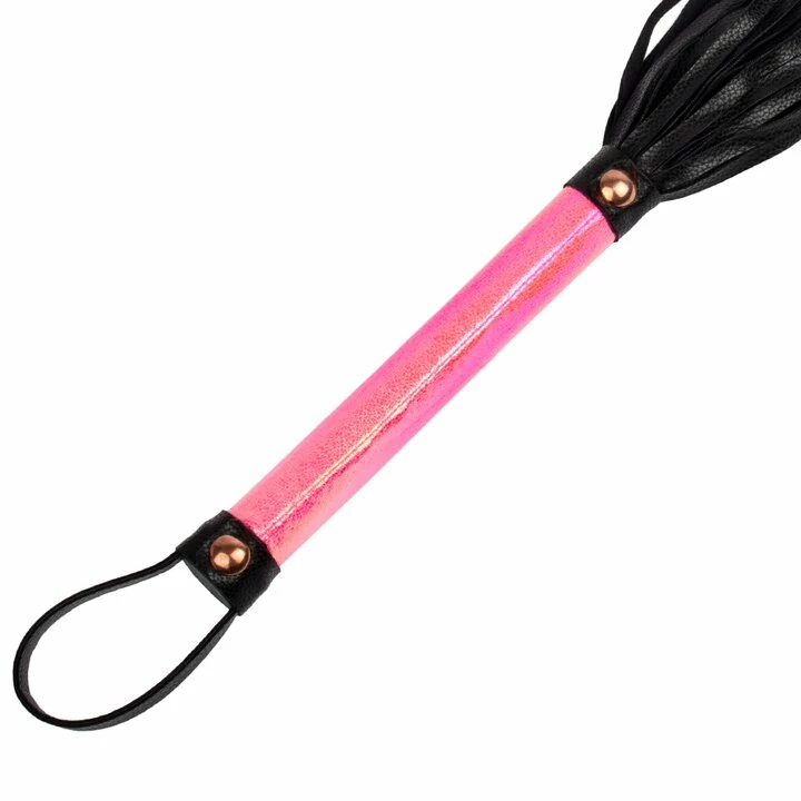 Take charge with the Pink Kink Faux Leather Rose Gold Flogger by Bondara. Lending your BDSM play a playful finish, this black and iridescent pink flogger features stylish rose gold studs on the handle for a stylish look and feel.