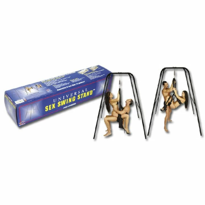 No more holes in your ceiling. This super free standing steel universal sex swing stand supports up to 400 lbs., and works with almost any sex swing available on the market. The wide support stance provides total stability and freedom of movement, while the built in steel loops are bondage ready. The Universal Sex Swing Stand assembles and disassembles in less than 10 minutes, comes with an English instruction leaflet and all necessary assembly tools (no additional tools required). The stand weighs ca 40lbs., and the compact components can be easily stored or transported when not in use. The Universal Sex Swing Stand is 7ft high with a span of 6ft. When buying a sex swing, the Universal Sex Swing Stand is an absolute must if you don’t have strong beams, if you don’t want holes in your ceiling and if you want your sex swing to be totally portable. Very highly recommended.