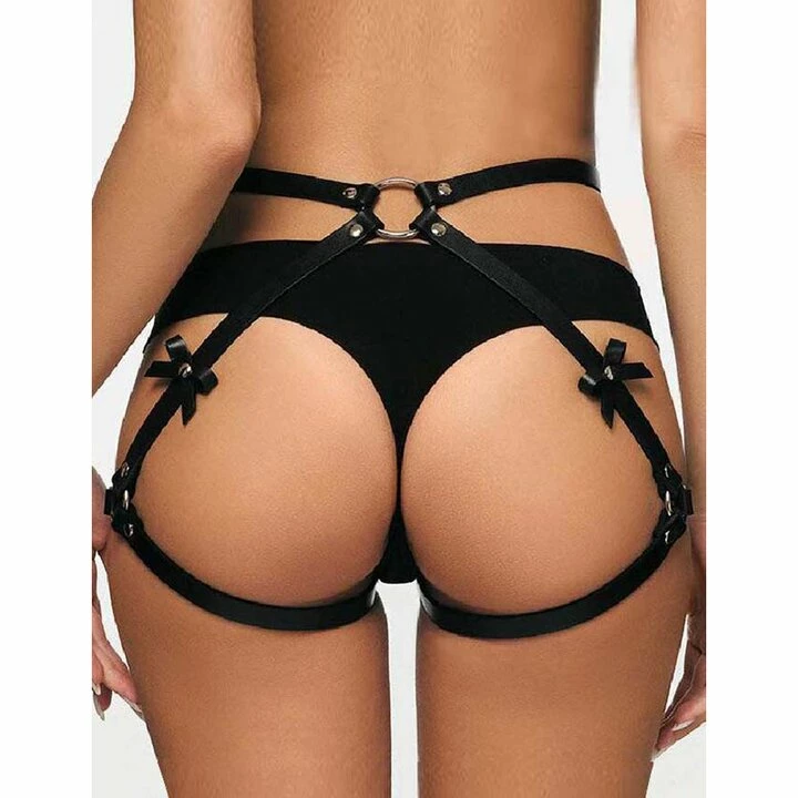 Adding a kinky edge to your late-night look, cute bows adorn straps across your bottom, while the belted thigh straps enclose your curves for a boosted, submissive allure. One size fits most and fully adjustable; easily fasten the belted waist and thigh straps to your perfect fit.